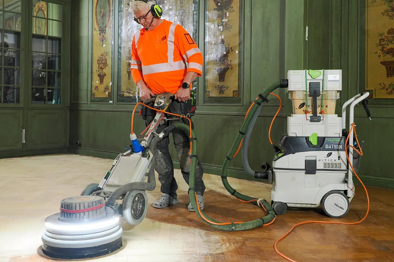 Om de ultieme reinheid te garanderen, werd ook de Festool SYS AIR Luchtreiniger gebruikt, die het fijne stof verwijdert dat in de lucht hangt en dat zelfs de krachtigste stofzuigers niet volledig kunnen bereiken wanneer het gereedschap in gebruik is. Met dit apparaat werd de reinheid van de ruimte op een museumwaardig niveau gebracht - zodat er veilig in het museum gewerkt kon worden zonder historische oppervlakken of artefacten te beschadigen.
