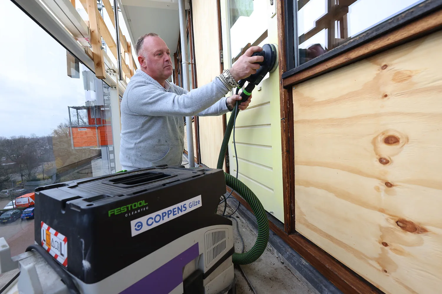 In Breda werkt Coppens Vastgoedonderhoud momenteel aan een omvangrijk renovatieproject voor woningcorporatie Laurentius: twee grote flats met in totaal 144 appartementen. Dit in opdracht van aannemer Van Wijnen. Coppens vertelt hoe zijn team daar de volledige schil van de gebouwen aanpakt. “Dat betekent het vervangen van alle draaiende delen, ramen en deuren, nieuwe beglazing plaatsen en het complete schilderwerk vernieuwen. Er komt heel veel schuurwerk bij kijken. We passen de Festool-machines hier dan ook veelvuldig toe. De techniek klopt. De afzuiging is sterk, het schuurbeeld is beter en je werkplek blijft schoner. Zeker in woningen of zorginstellingen maakt dat enorm verschil. Bewoners waarderen het ook als wij alles netjes achterlaten.”