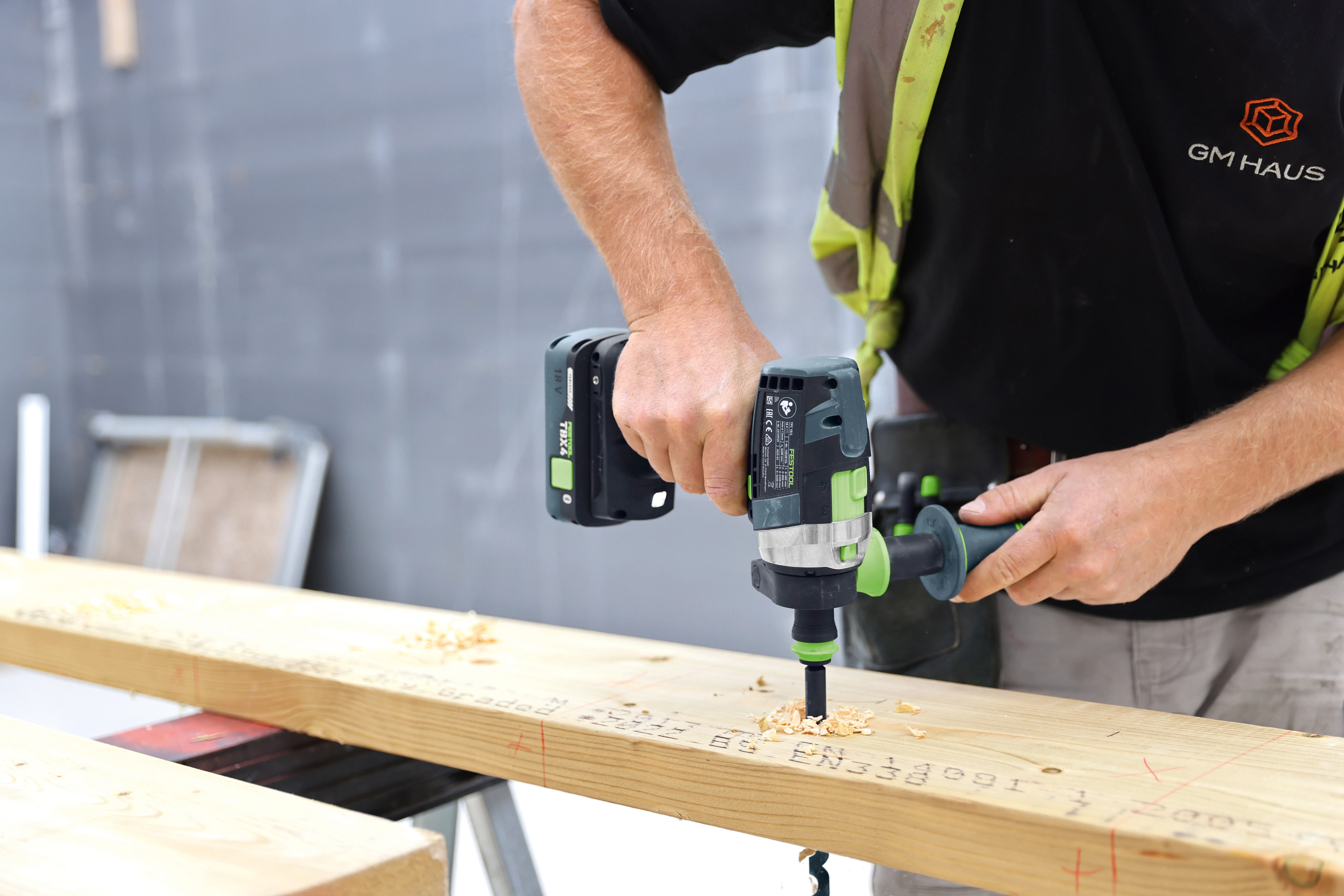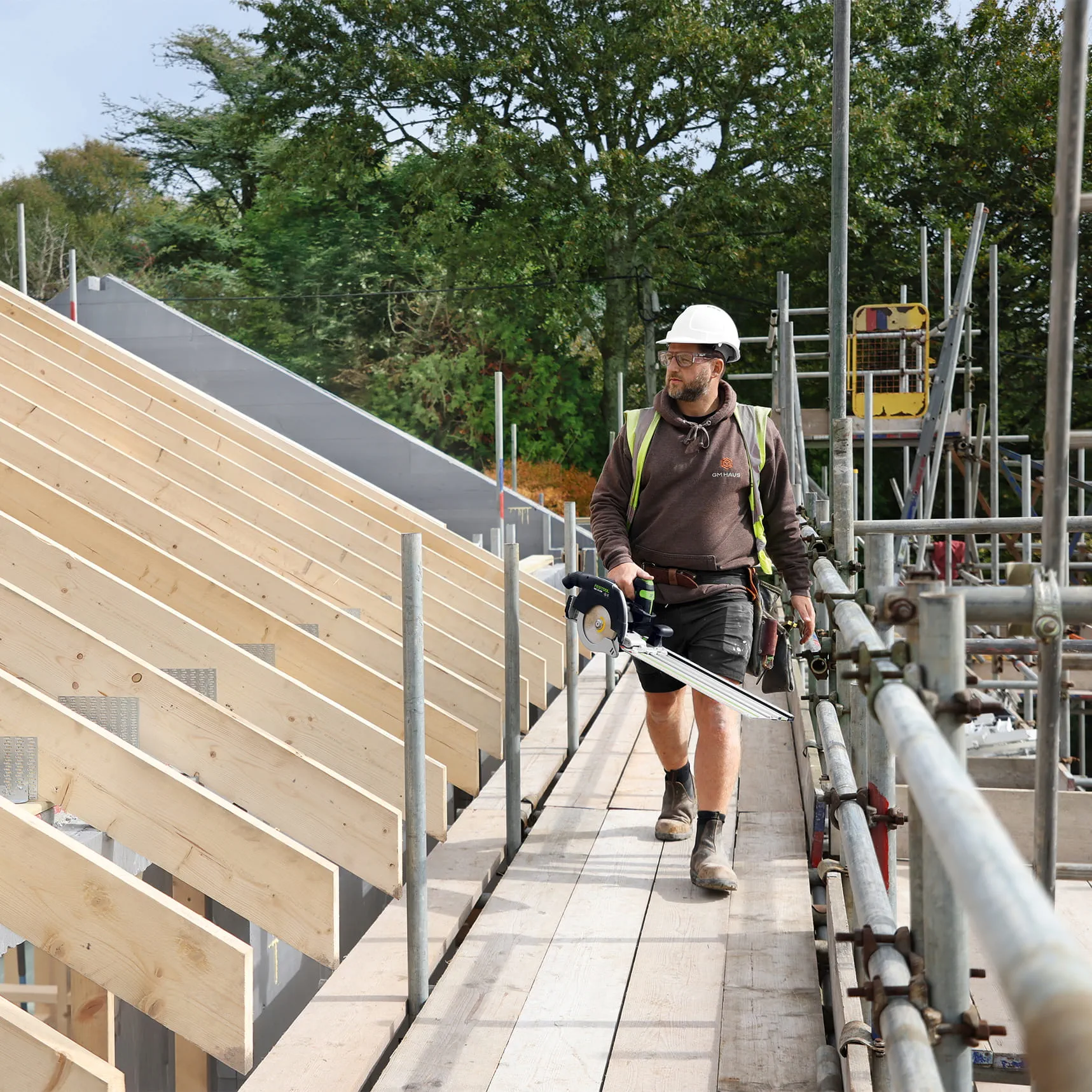 "Als we de vele structurele balken en staanders op maat zagen, moet dat snel en nauwkeurig gebeuren. De HKC met de Geleiderail is mijn constante metgezel."