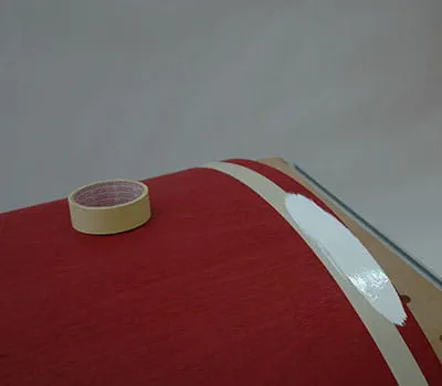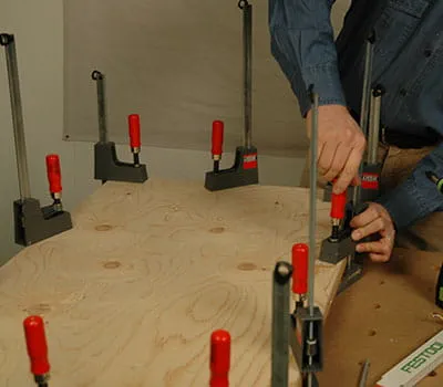 Om de exacte positionering later te vergemakkelijken, is het belangrijk dat u de dakoverstek markeert. Voor het verlijmen gebruikt u weer PU‑lijm. Voor deze werkstap moet u met twee personen werken. Ook is het aan te raden om het geheel vooraf "droog" (zonder lijm) te monteren. Breng de lijm aan op de dakdragers en bevestig de bekleding aan de ene buitenkant.