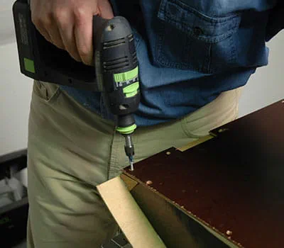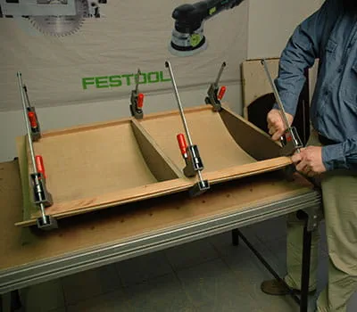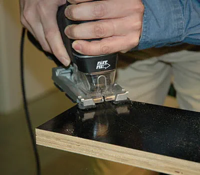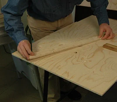 Laat de triplexplaten op maat zagen volgens de informatie in de materiaallijst. Als u de afzonderlijke platen zelf op maat wilt zagen, is de eenvoudigste manier om latten als onderleggers op de vloer te leggen en vervolgens met een invalzaag en een geleiderail de platen op maat te zagen. Het is gebleken dat het zinvol is om met de bouw van de beide zijwanden en van de bodem te beginnen.
