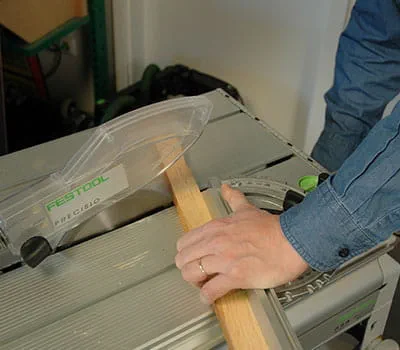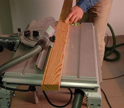 Om een exacte zaagkant te krijgen, zet u de pendelslag van de decoupeerzaag op stand 1. Gebruik de tafelcirkelzaag om de dakafsluitlatten in de lengte schuin af te zagen. Bij het maken van langssneden in massief hout is het absoluut noodzakelijk om een grof zaagblad te gebruiken. Zaag de lengte van de latten met de tafelcirkelzaag af.
