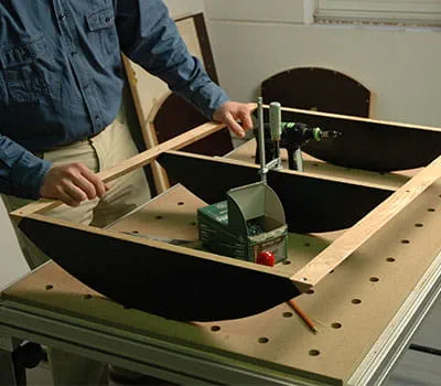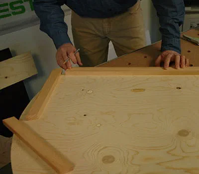 Markeer de breedte van de eindlatten op de dakdragers en zaag de hoeken af met de tafelcirkelzaag. Markeer de verbindingsgaten voor de schroeven tussen de eindlatten en ribben en boor de gaten (D = 4 mm). Schroef de dragers en de eindlatten aan elkaar vast. De dakdragers en de dakbuitenbekleding worden aan elkaar vastgelijmd.