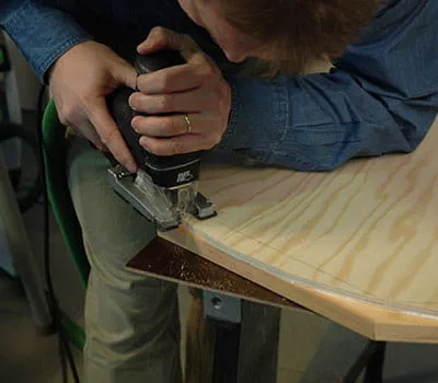 Als beide gevelwanden volledig gemonteerd zijn, worden langs de rondingen met de decoupeerzaag de binnenbekleding en de onderconstructie afgezaagd. Plaats de gevelzijden op de dakliggers (pos. 18) van de dakconstructie en breng de bovenste ronding over. Zaag de dakdragers met de decoupeerzaag uit.