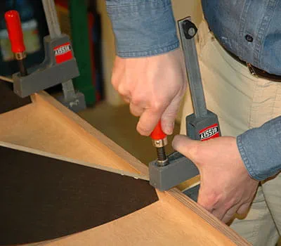 Wanneer alle binnenplaten en de bodemplaat (pos. 1) zijn vastgeschroefd, snijdt u de piepschuimisolatie op maat en plaatst u de platen in de vlakken. Markeer de posities van de onderconstructie op de buitenbeplating (pos. 6, 12). Deze wordt aan de rest van de wand vastgelijmd (PU‑lijm). Nu worden de afzonderlijke delen van de wand met klemmen vastgezet.