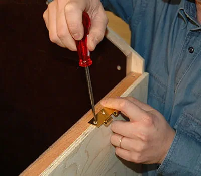 Als het dak opgelegd en uitgelijnd is, markeer dan de positie van de scharnieren. Markeer de buitenzijde van de wand aan de onderkant van de scharnieren met een puntboor. Verwijder het dak weer en schroef de scharnieren vast. Nu kan het complete hok gemonteerd en alle kanten en hoeken bijgeschuurd worden. Demonteer het hok weer en schuur alle buitenvlakken met een excenterschuurmachine.