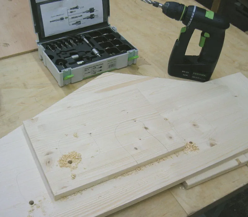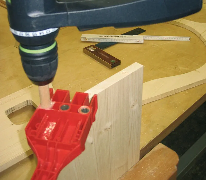 Boren van de pluggaten (ø 6 mm) in het dwarshout van de zijwanden met behulp van een plugsjabloon.