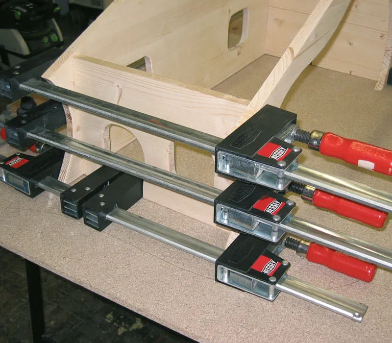 Met klemmen en lijmtangen of met speciale klemmen (bijv. kistklemmen) vastspannen. Op de deur twee klemmen plaatsen (zie afbeelding)