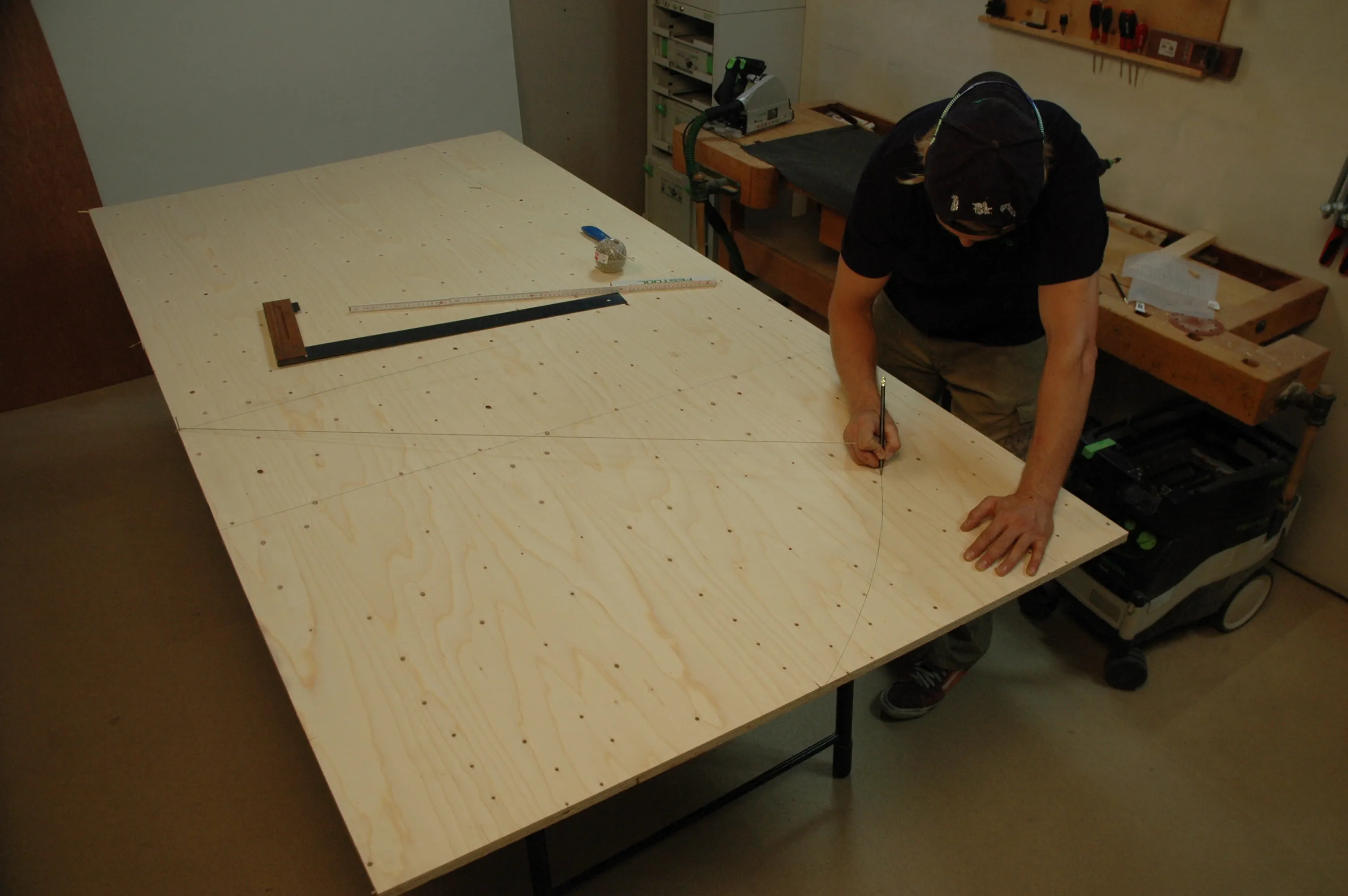 Sla een spijker in het eerste middelpunt en bevestig daaraan het touwtje. In een lus aan het andere eind van het touwtje wordt een potlood gestoken. Markeer eerst beide rondingen van een dekplaat, zaag ze uit en breng vervolgens de contour over op de andere dekplaat en op de bodemplaten (pos. 6).